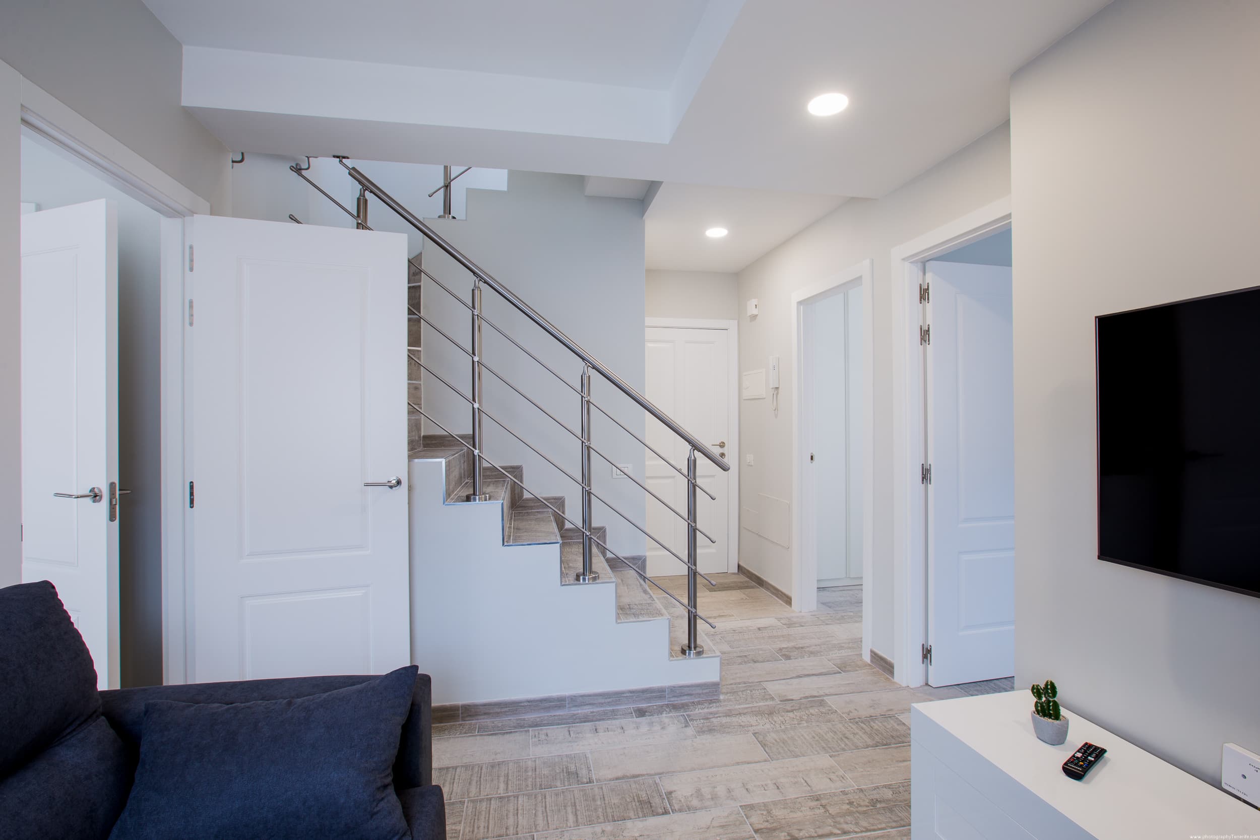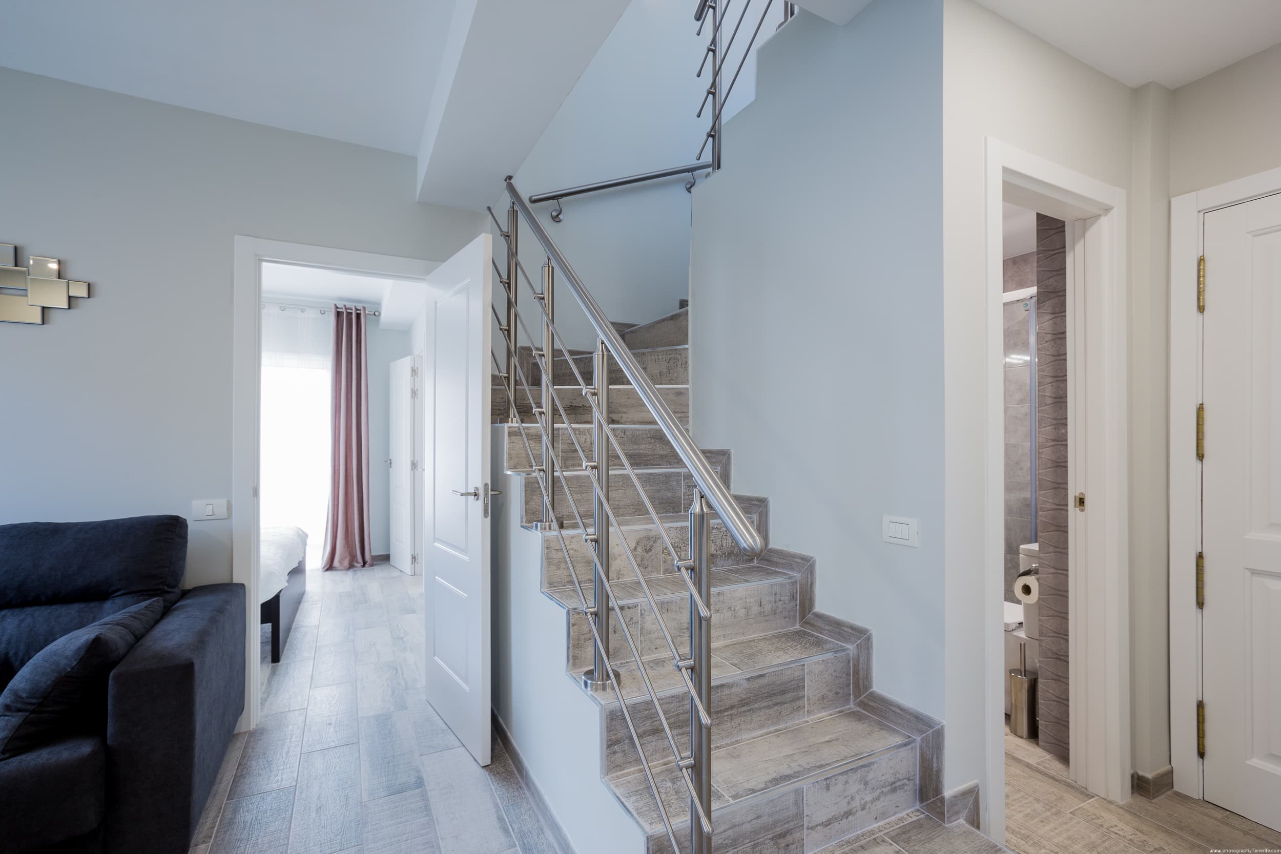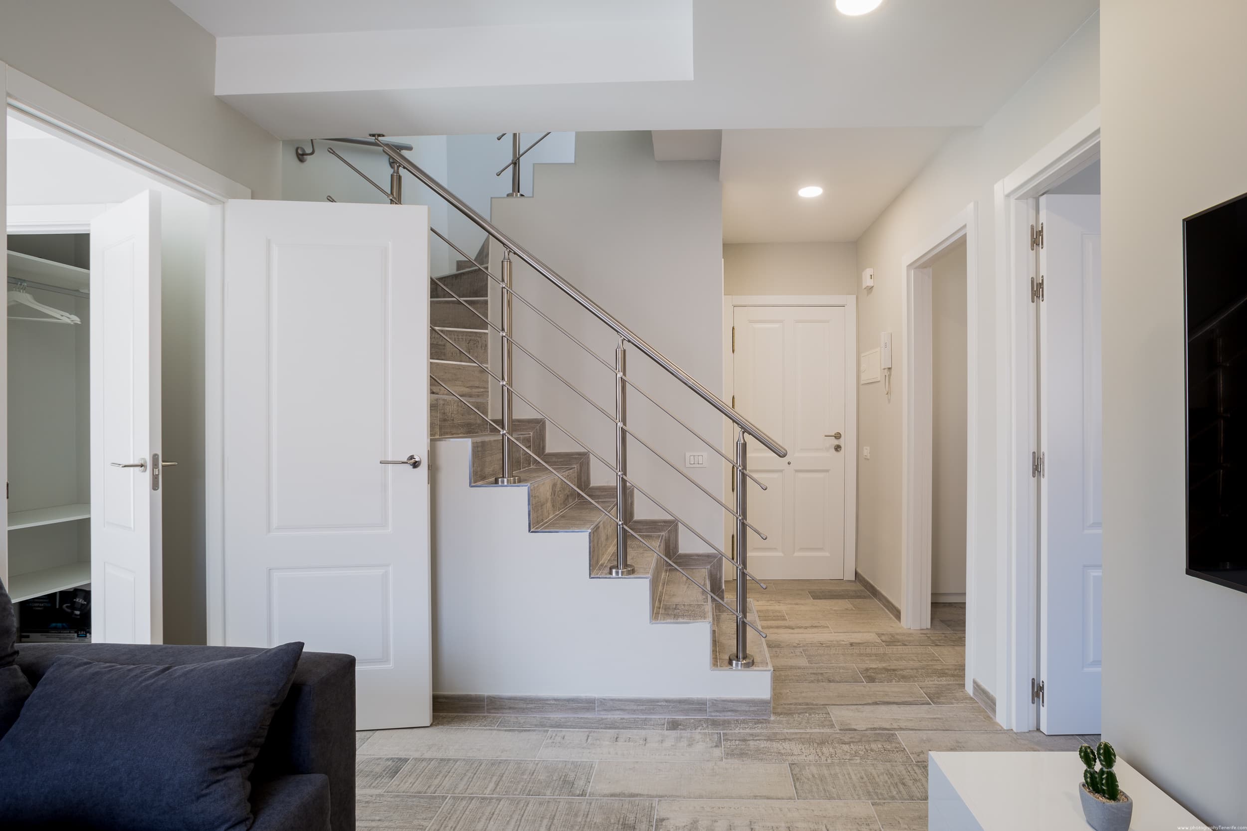 The apartment has two floors: on the first floor there are 3 bedrooms, 2 bathrooms, a small living room and a balcony. The master bedroom has its own bathroom and wardrobe, as well as access to its own private balcony. On the second floor, there is a large bright kitchen with a dining area, a bathroom, open living room, as well as a large terrace with comfortable furniture, equipped with an electric awning.