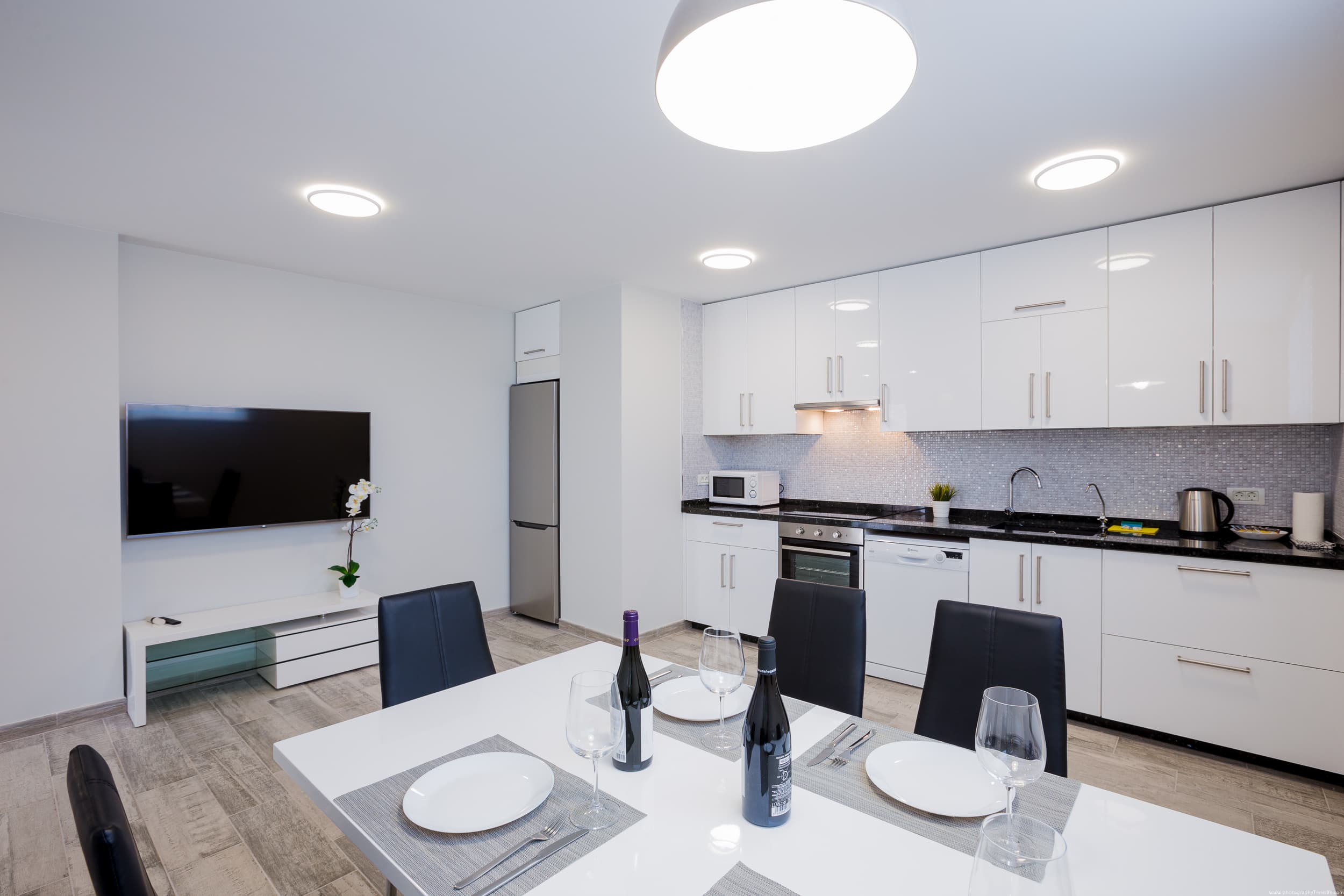 The apartments have: 3 bedrooms, 3 bathrooms, a small living room, a large dining room combined with a large kitchen, a terrace for relaxation with a magnificent view of the ocean. The complex has a lovely swimming pool with sun loungers.